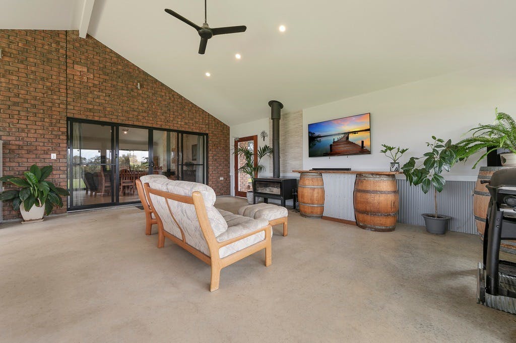 Boasting a wide return verandah, large windows, racked ceiling in the open plan living area, 2550m ceilings throughout the remainder of the home, family sized kitchen with stainless appliances, a big breaky bar, 900mm gas cooktop with electric oven, dishwasher and big butler's pantry. Catering and enjoying time with family will be a breeze under the expansive outdoor entertaining area. There is a bar, electrics for a wall mounted TV, combustion wood heater and room for a pool table and a spa. Boasting 13kw solar system with 12kw batteries with no power bills. Mains water and power connected. Covered orchard, water plumbed to yard and gardens and a cubbyhouse for the children.
